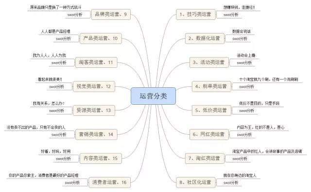 以上16点可以叫运营分类,也可以说一个店铺的方向,或者说一种赚钱的模式,当然还可以看作电商运营的一个个知识点!很多店铺他可能同时具体几种运营分类特点,同样运营人员也有综合以上几种能力!由此可以看出电商对运营职位技能要求越来越高,同样对店铺要求也越来越高了,下面让我们一点一点来看他们的优势、劣势、机会及威胁吧!