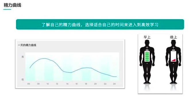了解自己的精力曲线,选择适合自己的时间来进入到高效学习,比如我的精力曲线,在上午的时候是最高,我会选择早上的时候来看看课程的视频,更容易进入到一个高效的状态。