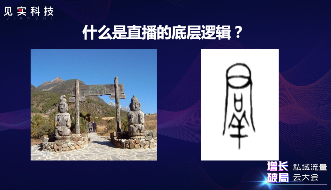 右边的图片是个甲骨文中的“群”字, 甲骨文是上中下结构,中间有个不起眼的小标识,其实代表“君”去管理“羊”时需要通过中间的工具实现。群主去管理群员时同样需要管理工具,这个工具就是我们今天要讲的直播底层逻辑,工具用得越好,社群的氛围就越好。