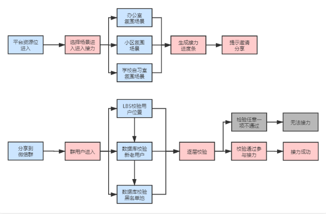 玩法逻辑:A用户发起接力赛→→邀请3位附近新用户接力→→系统通过LBS定位判断校验配送范围内→→系统通过平台数据库校验新老用户→→3位新用户接力完成分别获得新人礼包和特殊玩法礼包→→A用户获得百元实物礼包→→已经被转发的3位新用户同样发起二次接力