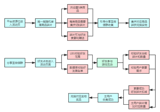 玩法逻辑:A用户进入活动页摇一摇→→随机掉落商品碎片→→所有碎片可与微信群好友索要与赠送→→通过好友的交换和摇一摇→→碎片收集完成兑换对应的实物奖品
