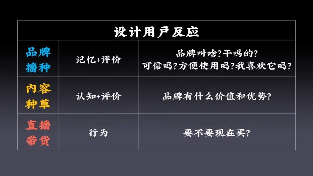 从这四种用户反应来看,直播无法唤起用户的记忆反应,毕竟一场直播上一大堆品牌,留给每个品牌的时间都很短,在这么短的时间内,消费者很难记住品牌。当然也很难在这么短的时间内给消费者做科普与教育,所以直播也做不了认知反应和评价反应。