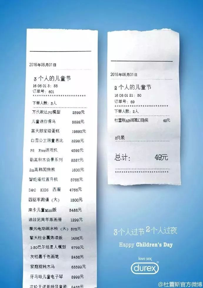 比如杜蕾斯在六一儿童节将两人账单与三人账单进行对比,拥有孩子后你将要花费无数多的钱,而做好防护措施后的你们只要花费一盒杜杜的钱,通过两者的对比造成用户有孩子后的恐惧,形成消费需求。