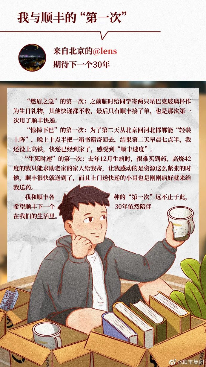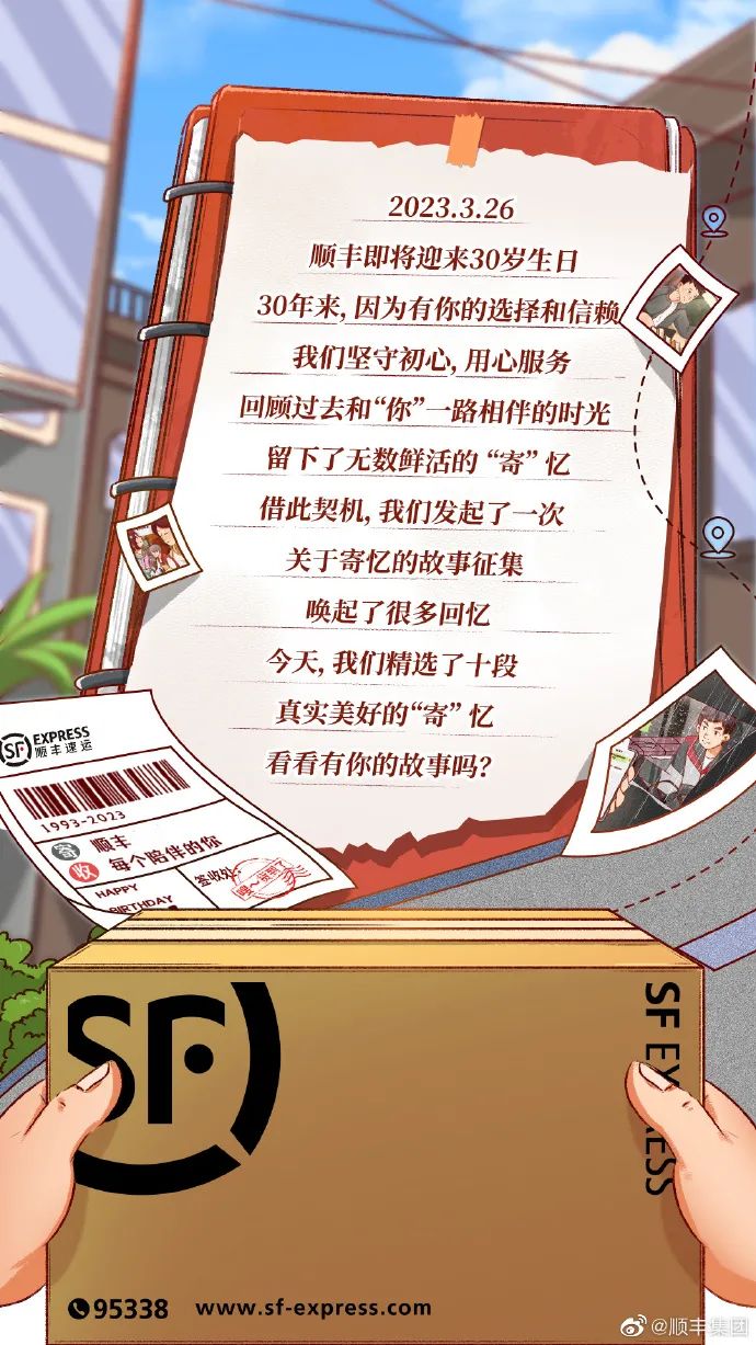 顺丰先是提前预热,面向广大网友发起了#那年那事 寄忆有你#的征集活动,引导用户自发讲述那些年与顺丰产生的特殊情感经历,可以是印象深刻的寄递故事,或某个特别的物品,也可以是与小哥的温情互动。话题一出,便吸引许多顺丰用户前来分享故事,也将30年庆生活动展露在大众眼前。