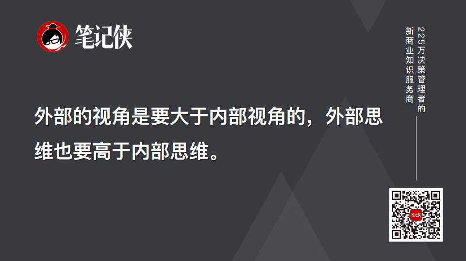 所以,我认为:外部的视角是要大于内部视角的,外部思维也要高于内部思维。