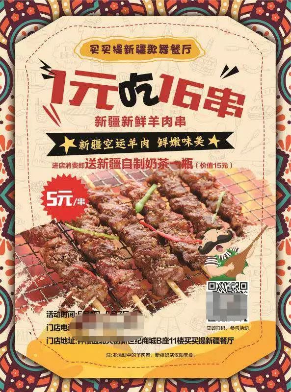 所以,做活动的时候,设计活动方案的时候,要记住的是你的活动福利:要让顾客明确的知道活动的利益(一元吃16串羊肉串)。