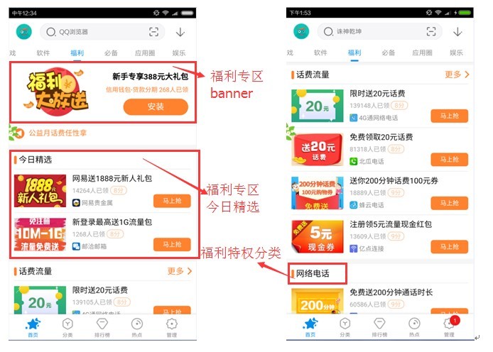 福利资源:推荐首页入口、福利专区、首页卡片位,软件banner位,软件卡片位,应用列表福利标红,搜索结果福利标红,曝光时展示,产品详情页展示