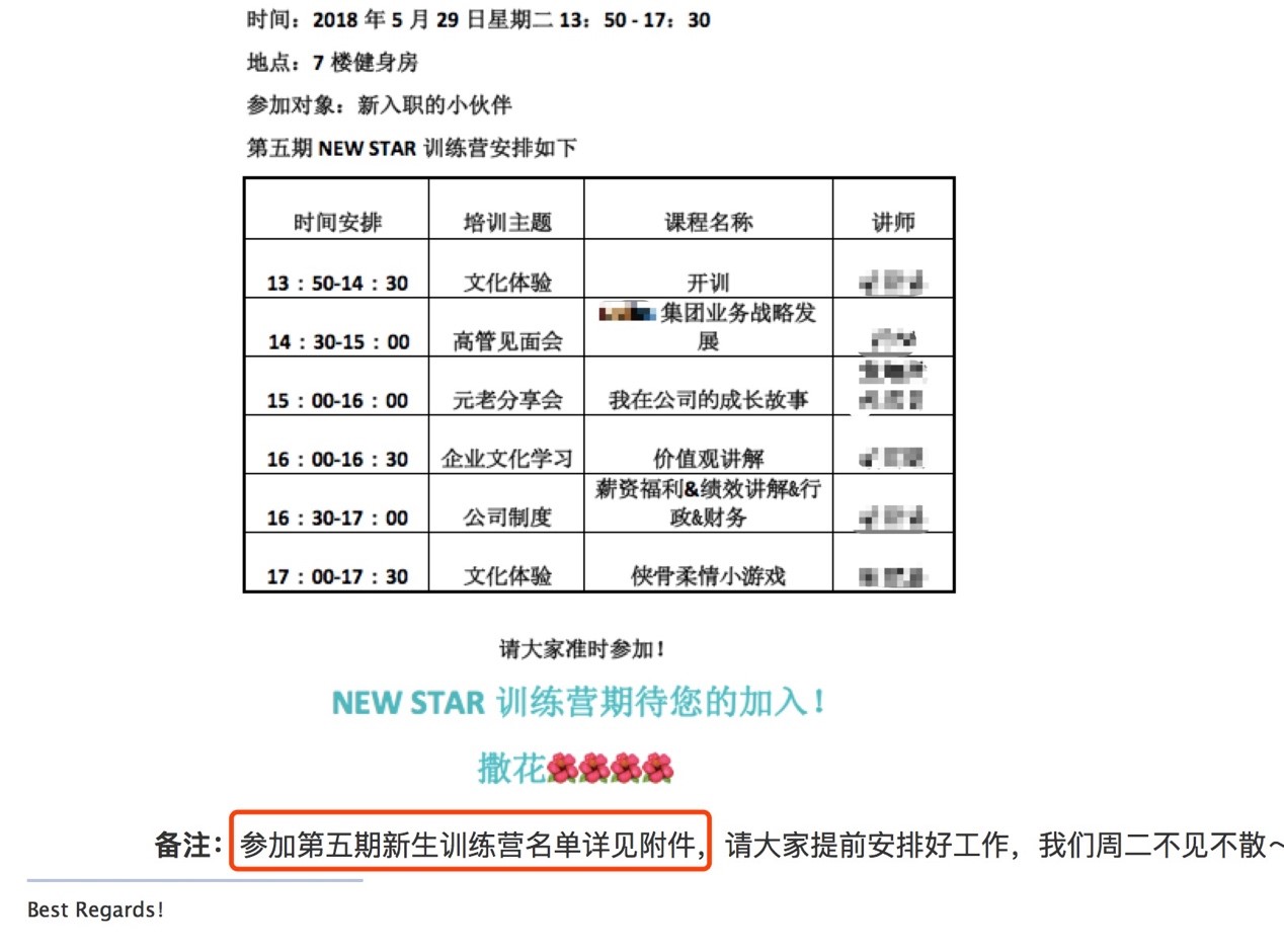 (例如此邮件就是充分考虑到阅读体验,把关键的时间安排环节贴图在正文,而附属的并不需要每个人阅读的名单选择挂在附件)