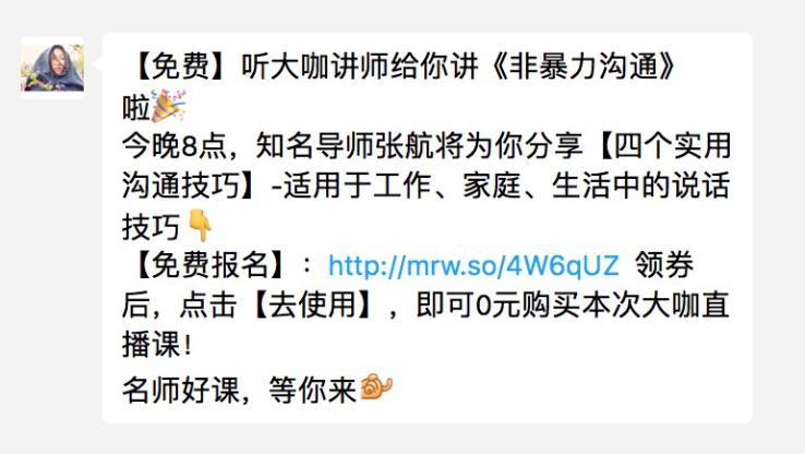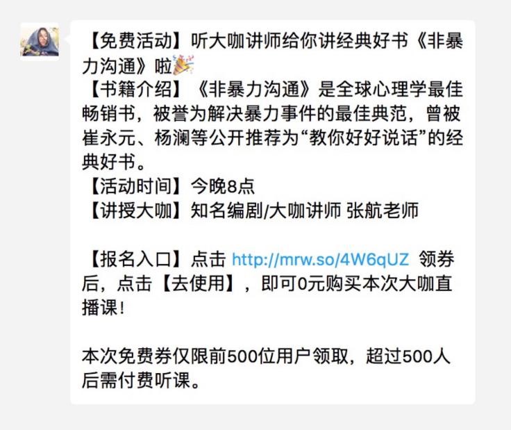 因为实际推送的是服务号,所以其实文字大概出现到“【免费】今晚大咖讲师给你讲《非暴力沟通》啦”。