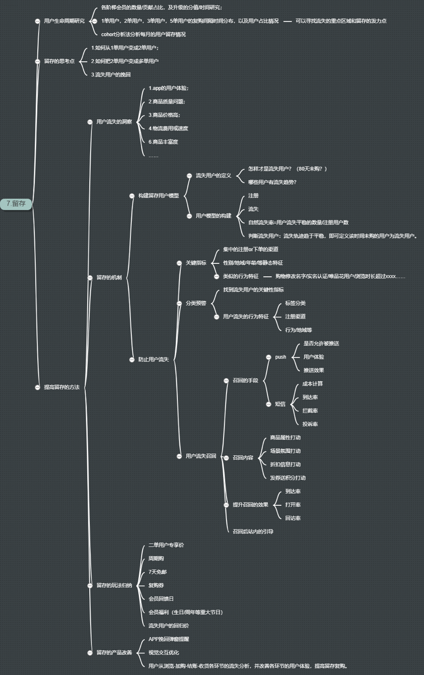 ②制定一个留存机制:留存机制主要是两个方面,一个是用户留存模型,另一个是用户挽回制度。留存模型是根据用户的生命周期研究得出的,什么时间没回购的是流失用户?用户挽回模型,则是通过一些分类预警监测用户流失,并且通过push/短信/邮件等方式挽回用户,通知用户,防止用户流失。