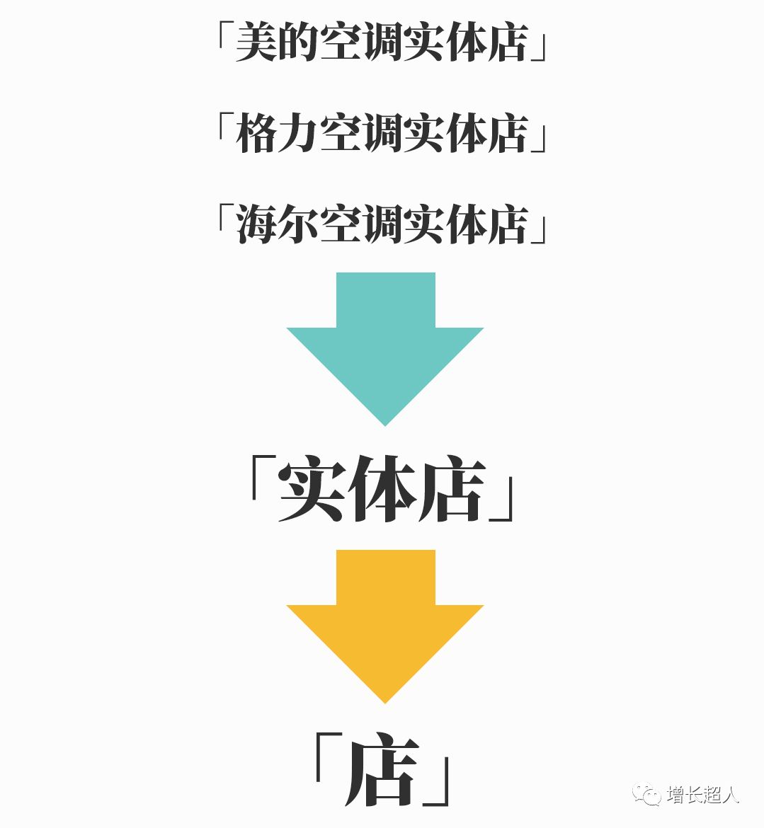 还是以维修为例,很多搜「美的空调实体店」、「格力空调实体店」、「海尔空调实体店」等词,提炼出相同项「实体店」将其设为否定关键词即可,甚至可以将「店」设为否定关键词,更为精简。