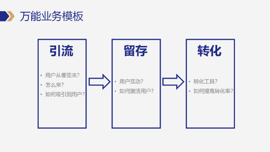 在运营领域其实有一个万能的业务模板,即引流、留存、转化这三个核心环节。无论是什么类型的业务,其实都可以套用这个模板。比如社群运营、用户增长、电商等等的。所以企业私域营销当然也可以套用这个模板。