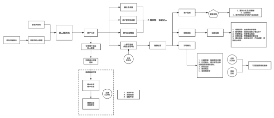 在引流环节,主要是通过小程序粉丝、第三方公域平台来进行用户引流,然后以社群为主要的私域流量承载工具,当然它也会主动引导用户添加企微号,这样可以便于通过企微SCRM系统,对用户进行打标、分层等一系列的用户管理动作。
