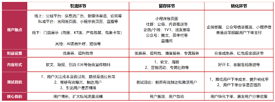 比如,在策略层面,引流环节,需要制定具体的引流策略和输出方案,包括裂变营销的具体玩法;而在留存环节,要制定用户管理策略、用户互动策略、用户成长体系等等,在转化环节,可以策划活动促销方案。