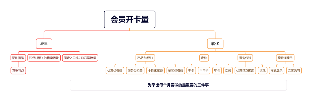 如果是产品初期,那么可能是流量的问题,需要找各种流量场景进行切入,从而来提升付费会员的覆盖。这个时候可能流量就是影响目标的关键因子。如果是产品中后期,已经进入成熟阶段,这个时候重点就在于提升用户的转化,而不是一味地进行入口的铺设。