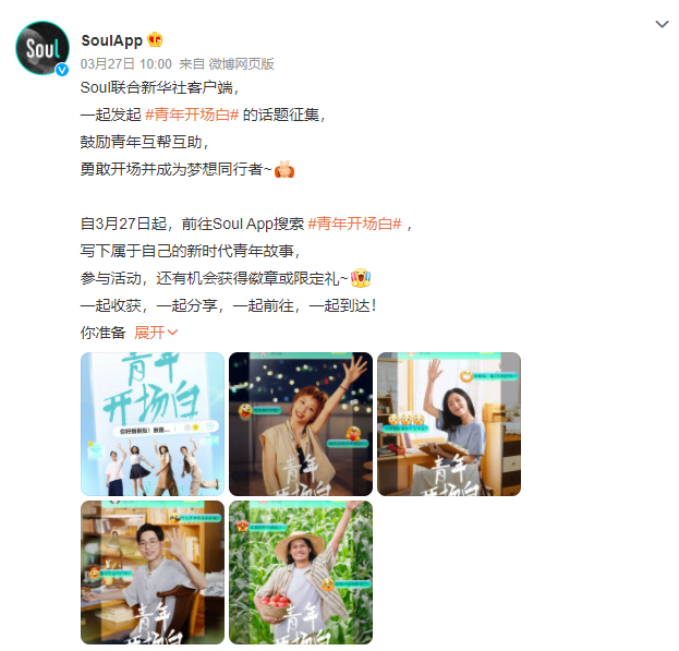 在官微上,Soul发起 #青年开场白# 的话题征集,只要用户写下属于自己的新时代青年故事,就有机会获得徽章或限定礼。