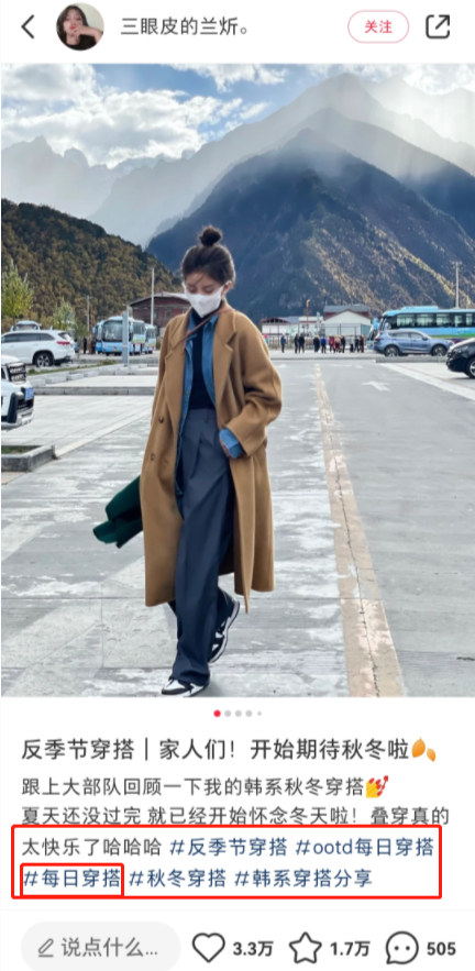 我在穿搭类随意选择了三篇互动量较好的文章,他们都提到了#每日穿搭 这个话题