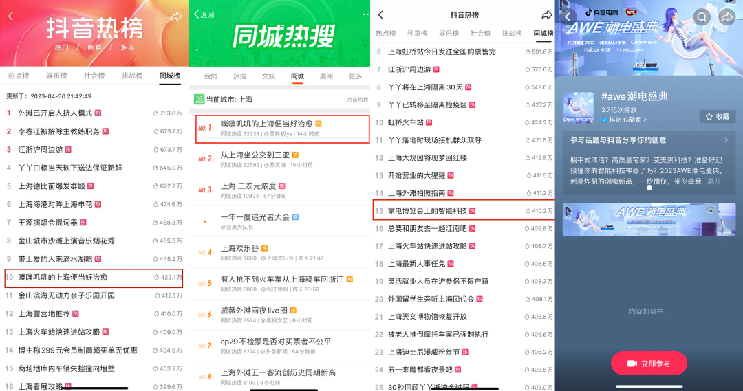 本身就具备高人气的达人,叠加符合品牌调性的内容,“AWE心动逛展团”收获了高热度和高讨论度。数据显示,本次AWE结合不同品牌调性投放不同类型圈层的达人,共打造2个50万+、2个30万+高赞视频。噗噗叽叽抖音电商展会现场摆摊事件,还登上了抖音上海同城榜TOP10,微博上海同城榜TOP1。