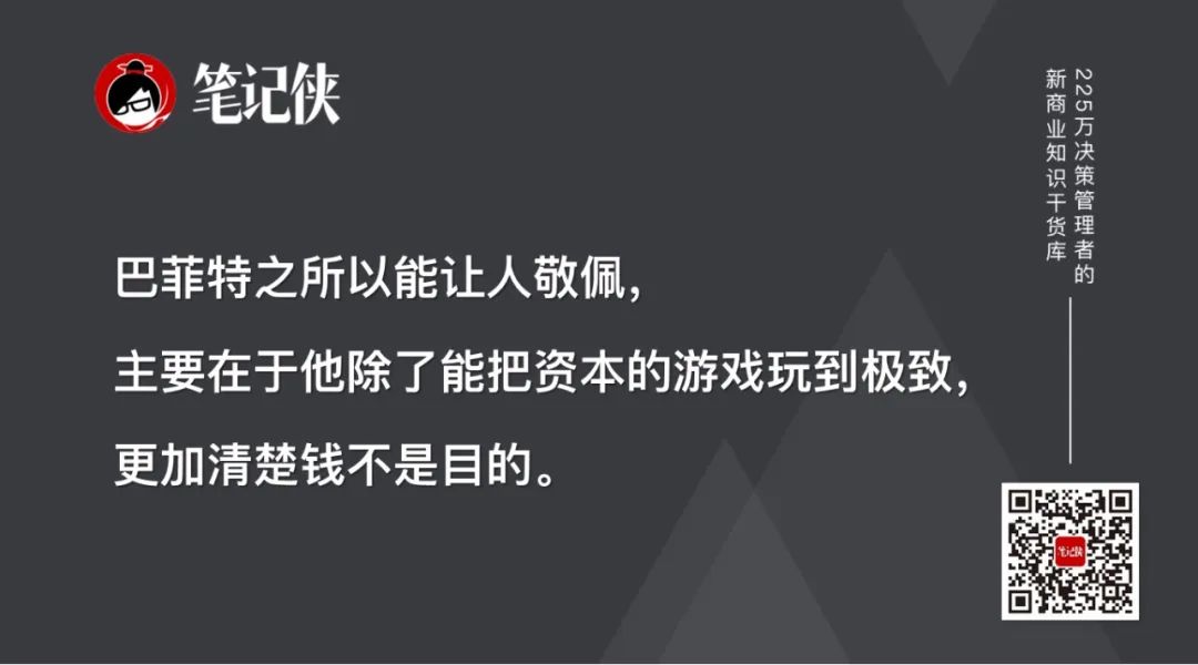 巴菲特之所以能让人敬佩,主要在于他除了能把资本的游戏玩到极致,更加清楚钱不是目的。