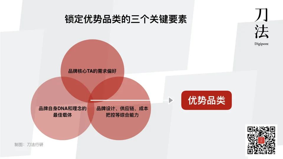 卡宾锁定优势品类的方法是使用“三圆模型图”——品牌核心 TA 的需求和偏好、品牌自身 DNA 和理念的最佳载体、品牌在设计、供应链、成本把控等综合能力的最佳体现,这三个圆的重叠部分,就是优势品类所在之处。