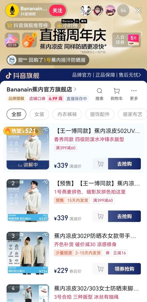 首先,蕉内在内容场与头部达人的合作,将达播销售占比从 15% 提升至超过 20% 。本次活动期间,蕉内全系列内衣登上东方甄选、交个朋友等头部直播间,有效提高品牌认知度并持续种草。同时,蕉内优化品牌自播,活动期间升级自播间装修风格,围绕防晒产品季节性强的特点,优化直播话术。