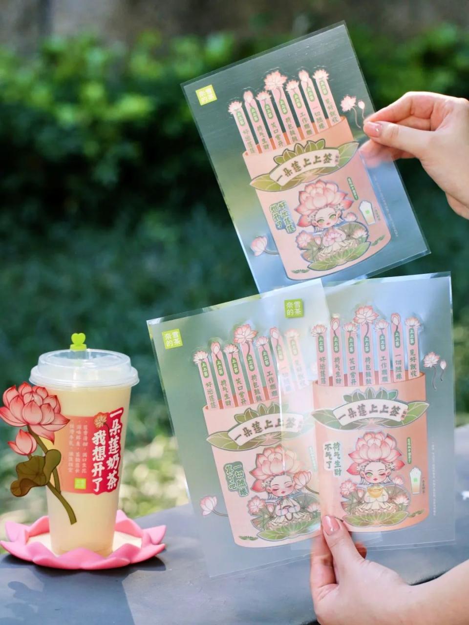 满屏“我想开了”“大彻大悟”佛系语录的包装手提袋,集满“荷包鼓鼓”“一切随缘”美好祝福的上上签贴纸,再加上可爱独特的荷花仙子杯贴和莲花宝座杯垫。