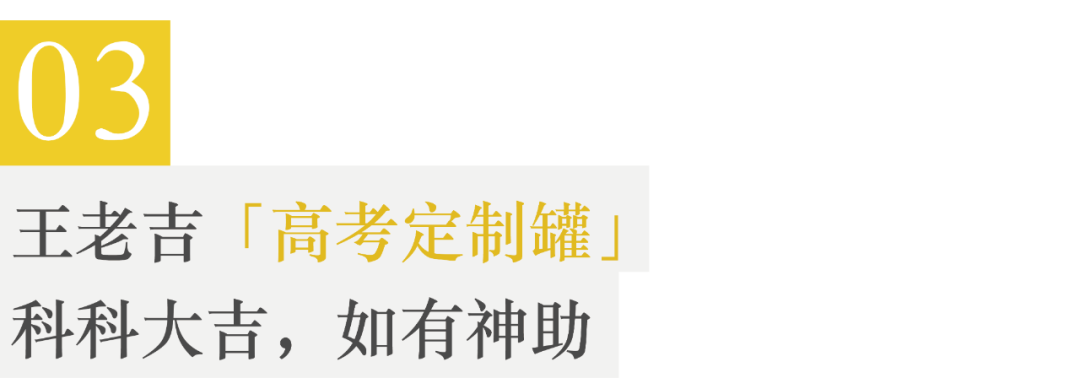 为了给高考生们送去真挚祝福,王老吉抓住品牌名“吉”的美好寓意,特别自制了“高考大吉罐”“学科罐”“高三班吉罐”“手写吉愿罐”“万试大吉罐”五款高考系列定制罐,让产品自带“神力”,引得大家自愿前来沾沾好运。