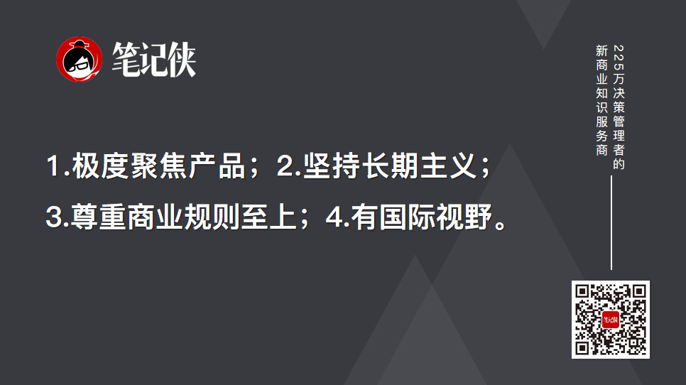 他们往往具备着很多共通性,我将这些特质总结为四点:1.极度聚焦产品;2.坚持长期主义;3.尊重商业规则至上;4.有国际视野。