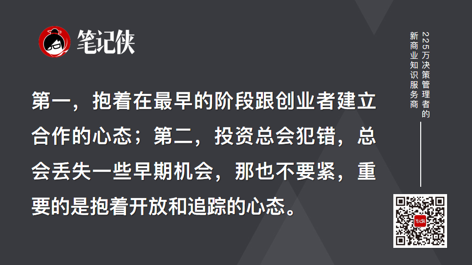 这里面有两个维度:第一,抱着在最早的阶段跟创业者建立合作的心态;第二,投资总会犯错,总会丢失一些早期机会,那也不要紧,重要的是抱着开放和追踪的心态。