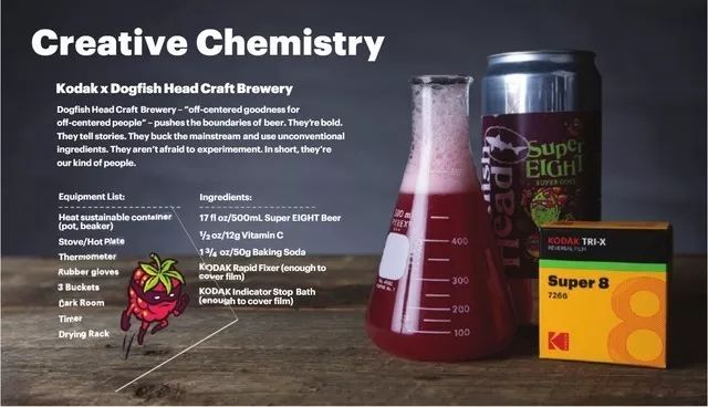 不仅如此,最近还勾搭上了精酿啤酒品牌“角头鲨 Dogfish Head” ,推出一款可饮用、也可以用来冲洗胶片的 Super Eight 啤酒。