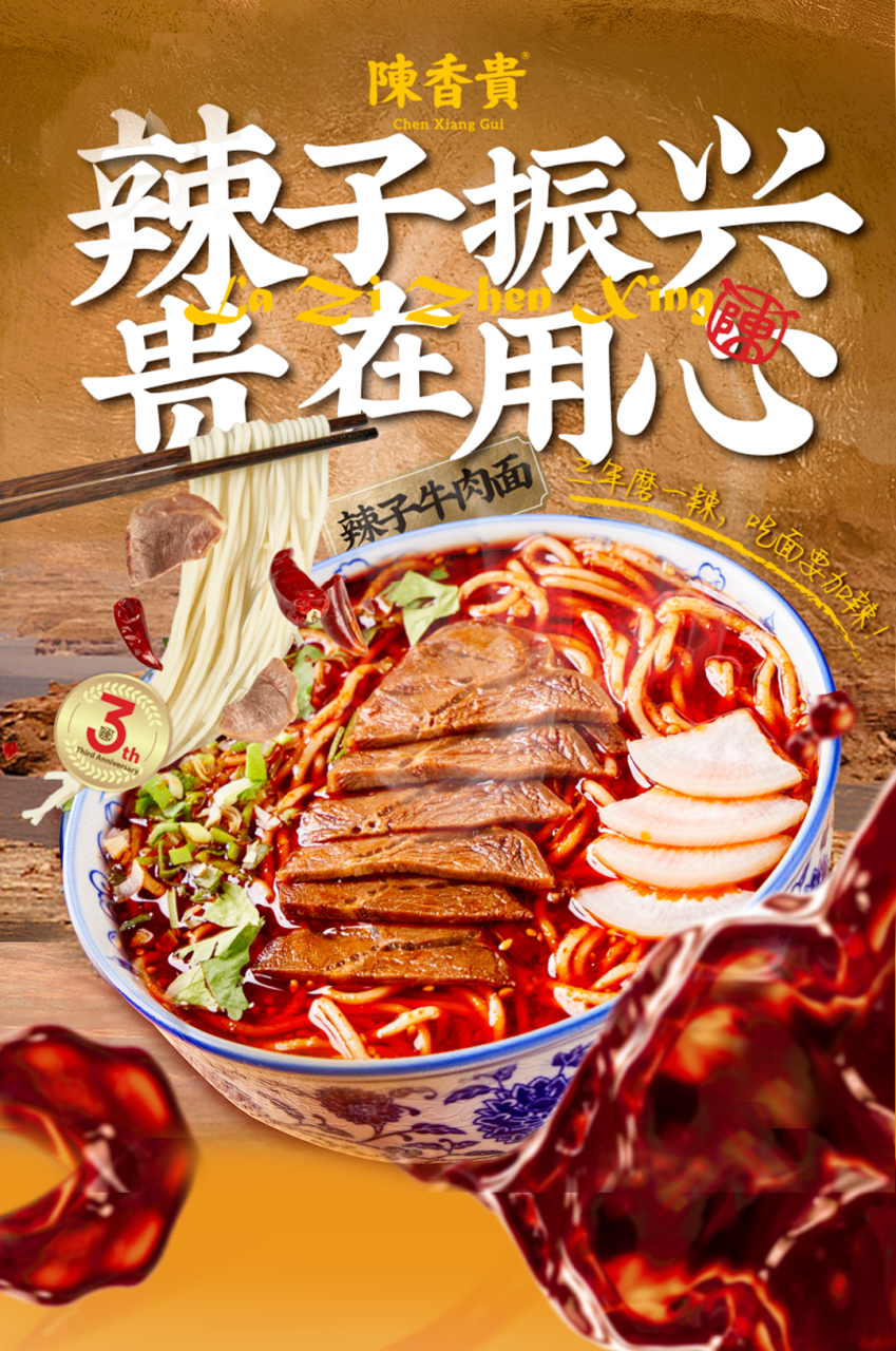 此次品牌三周年之际,也推出了新品“辣子牛肉面”,这款新品一经上线就热度爆表,单日销售35000,多个门店直接断货,可谓出道即“顶流。陈香贵始终坚持的就是,在好吃的功能性需求上,带给消费者超值的情感需求。