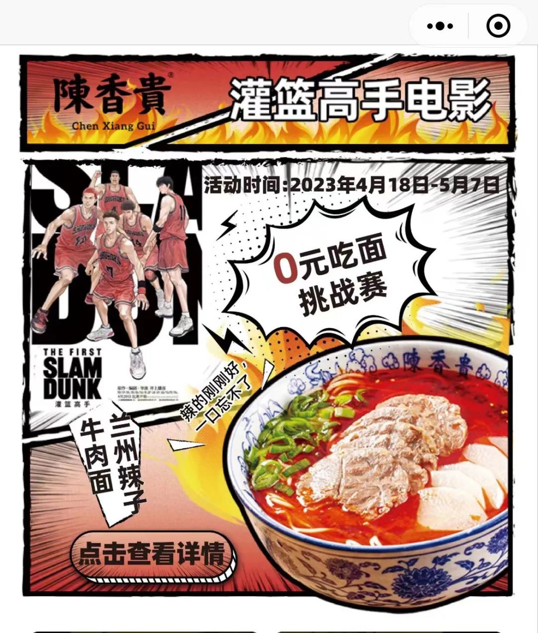 万万没想到,陈香贵兰州牛肉面也带头玩起了回忆杀,以“热血灌篮 火辣见面”为主题,不仅在小程序上推出了0元吃面挑战赛,还在抖音送起了电影票,让80后、90后都跟青春见见“面”。