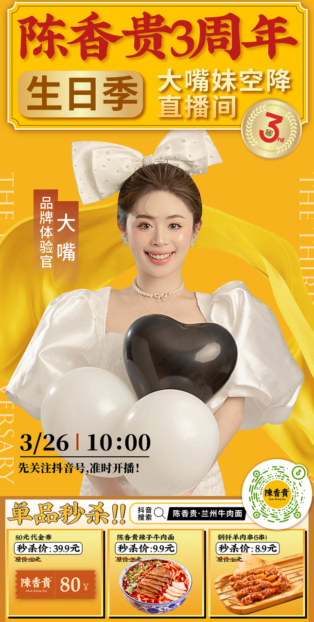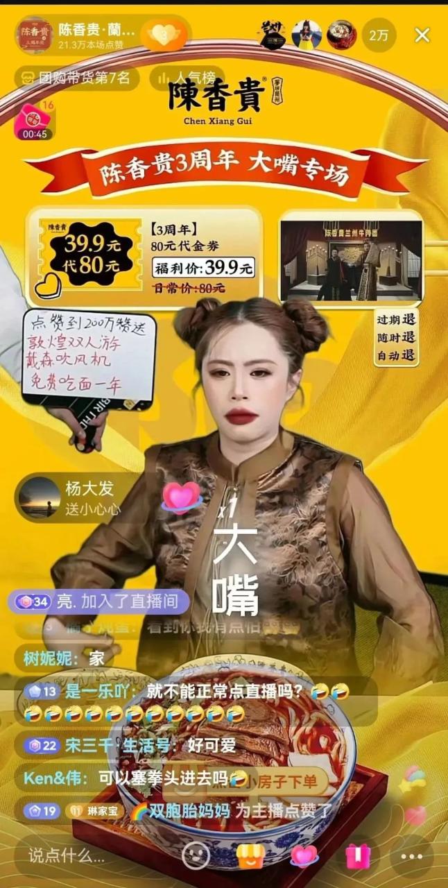 在品牌的周年庆活动期间,陈香贵还在抖音开启了品牌自播,进一步提升品牌调性、占据消费心智。品牌体验官大嘴空降,引爆直播间热度的同时,也补足了垂直渠道的人群缺口。在此过程中,陈香贵兰州牛肉面的声量被放到最大,直播观看人数超100W+,实时在线人数超2W+,勇夺餐饮上海直播热榜TOP1、面类官号直播交易额TOP1。