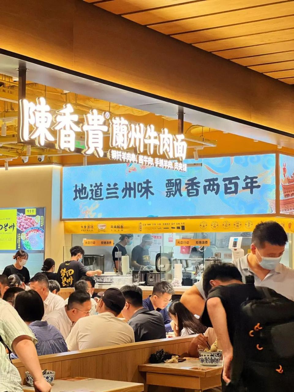 一般的兰州拉面,都是开在街道上,看起来有点低端,而陈香贵把店开在高端的大商场或者购物中心,门店设计更具国潮风格,整体简约明亮、干净卫生,让人眼前一亮,吸引不少精致白领。