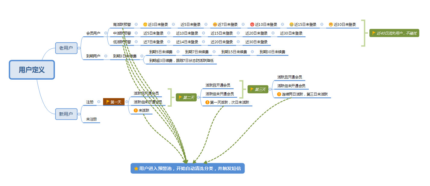 - 比如:A用户召回后,此时系统会自动标记该用户为正常用户。假如七日内,该用户再次触发沉默或流失行为,又会自动对其进行一波短信触发,不适合精细化运营模式。