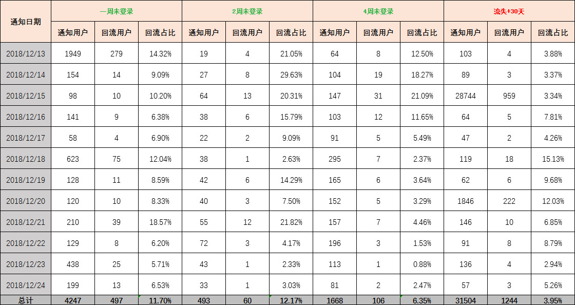 (4)如果维护池用户回流后的3-7日再次出现流失行为,则该类用户对产品无明显需求,反之也无意义,应该永久丢进流失池;如果将其归类正常用户,多频次短信还会造成骚扰,反倒对产品品牌不利。