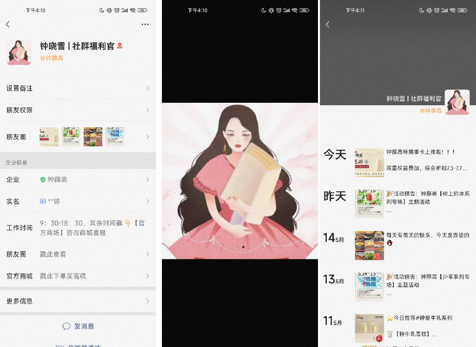 朋友圈内容:主要内容以新品推广、优惠放送为主。偶尔也会有一些“生活化”的内容