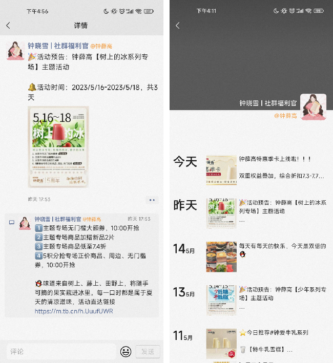 4)社群活动形式单一:相比多品类的餐饮、快消品牌。钟薛高的社群活动形式比较单一,互动率较差。
