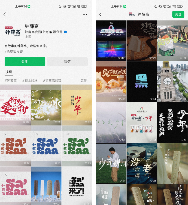 钟薛高的视频号偏重于品宣。主要视频内容以公益活动、新品宣传、情景剧场为主。目前,账号还没有稳定地做直播。