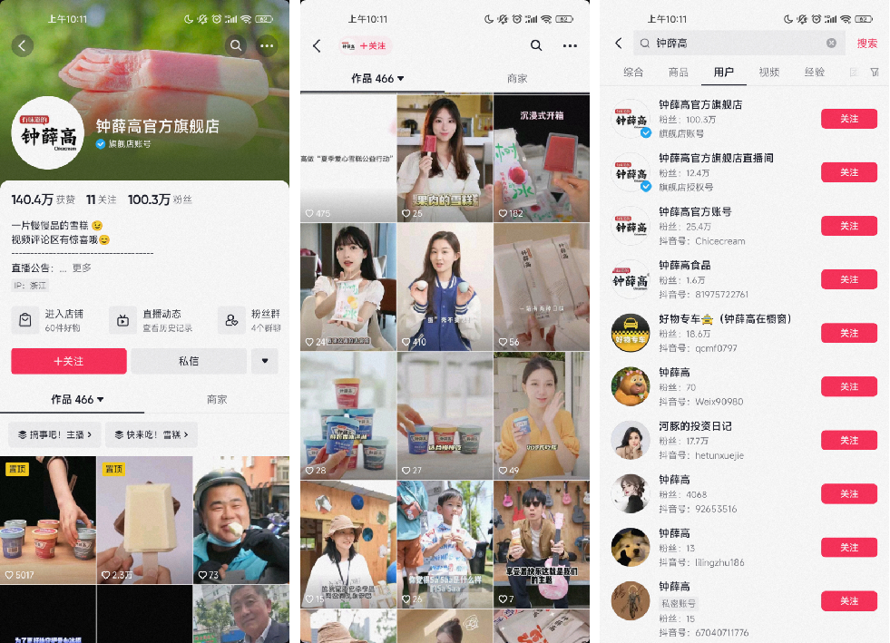 钟薛高在抖音上建立了矩阵,3个号的总粉丝数超137万。且定位各不相同,分别是品牌宣传(产品种草)、直播卖货以及情景剧的形式。
