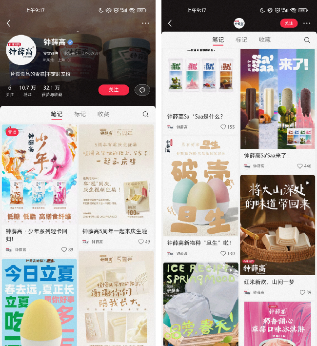 钟薛高官方账号目前粉丝为10.7万,笔记内容以产品种草、新品上新、活动宣传为主。