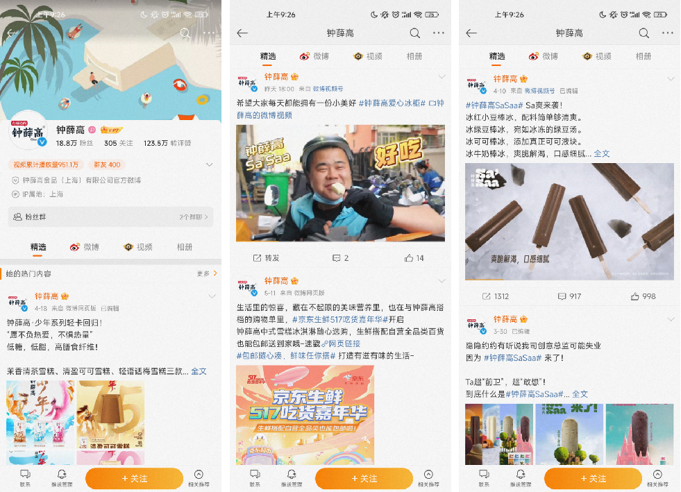 钟薛高在微博的粉丝数为18.8万,其微博发布数量达到1355条。目前钟薛高的微博更新频率基本保持在每天1-2条。