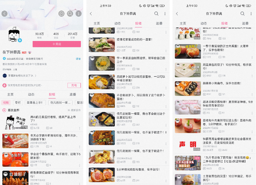 内容方面,钟薛高目前以“教你做菜”为主,并未太多的植入产品广告。不过播放量和粉丝数较理想,目前已拥有30.8万粉丝,获赞201.4万。