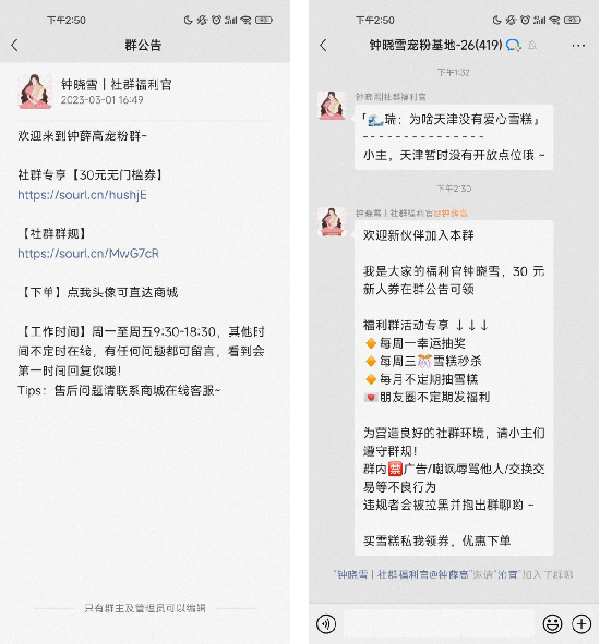 用户入群后会在第一时间收到入群欢迎语,告知社群福利。钟薛高在群公告中明确写有群规和工作时间。方便用户快速了解社群利益点,建立信任。