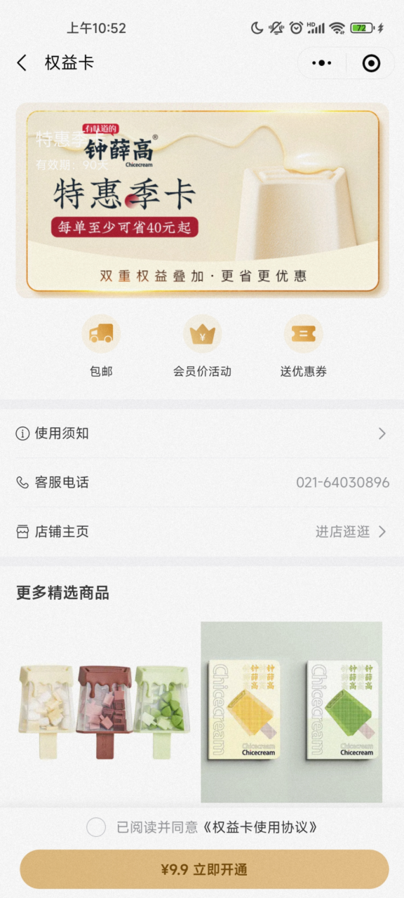 钟薛高推出「特惠季卡」,9.9元开通可享有包邮、会员价活动、送优惠券等会员权益。