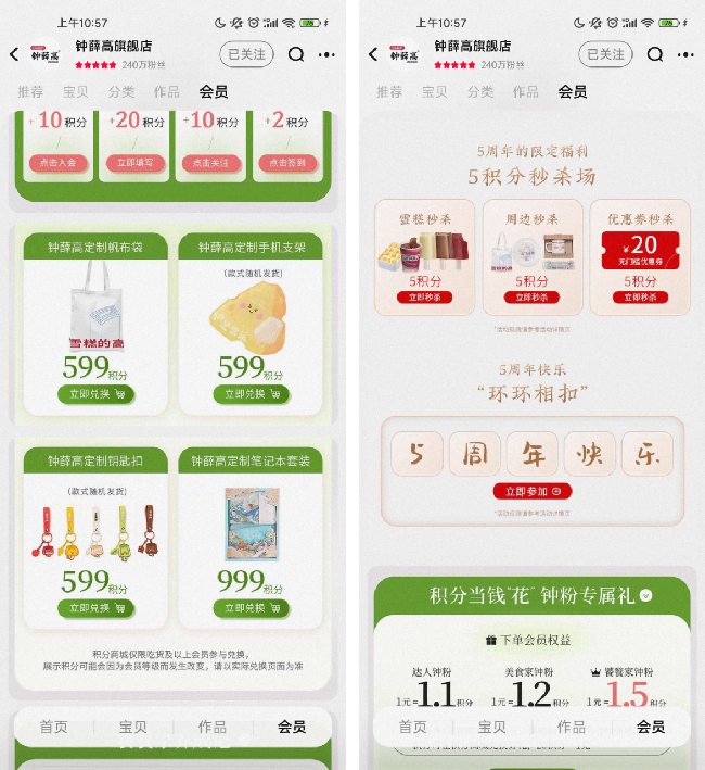 钟薛高在淘宝和小程序端口都设置了「积分体系」。用户可以通过消费获取积分,积分可用兑换优惠券,或定制款冰箱贴、笔记本、帆布袋、耳机等礼品。