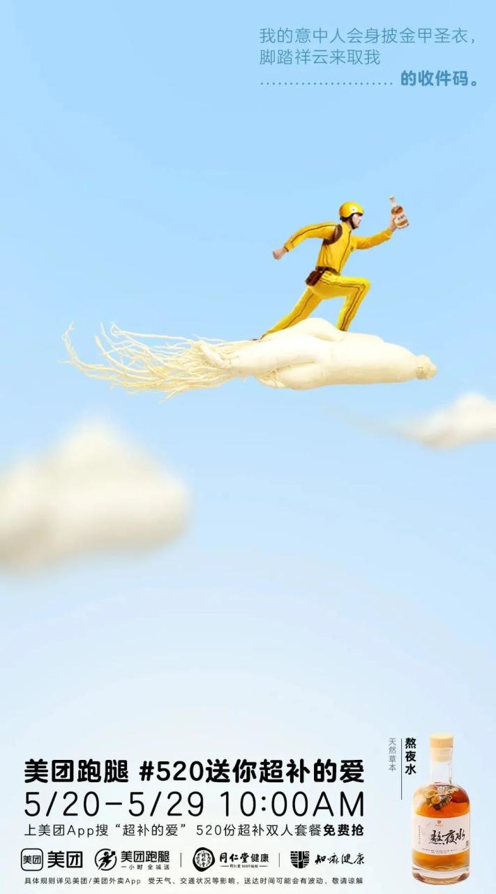 一方面,美团跑腿X同仁堂知嘛健康打造的“520送你超补的爱”,在借势节日制造话题之时,将“花”和“补品”创意地结合起来组成了“人参花”。在大家还在单独送鲜花和蛋糕等等其他礼物的时候,这种既可以给另一半送上一份“花”表达心意,也能送上一份养生的、滋补的、关爱的、差异化的礼物,在吸睛的能力上表现颇为不俗。