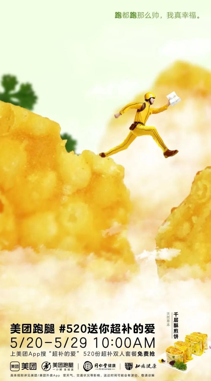 所以在用户对品牌价值的认知层面上,美团跑腿先是携手同仁堂旗下深受年轻人喜欢的新锐品牌同仁堂知嘛健康,来锚定重视中式养生的年轻人。同时,在创意上则选择了人参熬夜水、肉桂拿铁、千层酥煎饼等店内最爆款中式草本轻养食品,组成美团跑腿限定版的“520超补的爱双人套餐”,通过双份的“超补的爱”为噱头在节日吸引用户,这就极大地撬动了用户的关注度。