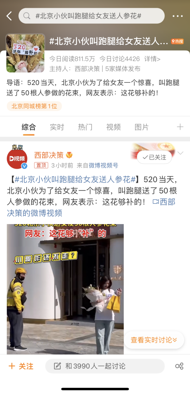 520这天,北京一个小伙给女友准备的礼物,是叫跑腿送去的用50根人参做成的花束。大概,没有人能拒绝这样一份既浪漫又超补的爱吧!所以兵法先生一点也不奇怪这个话题,会狠狠赚一波吃瓜网友的羡慕。
