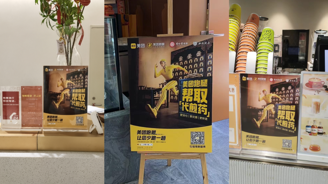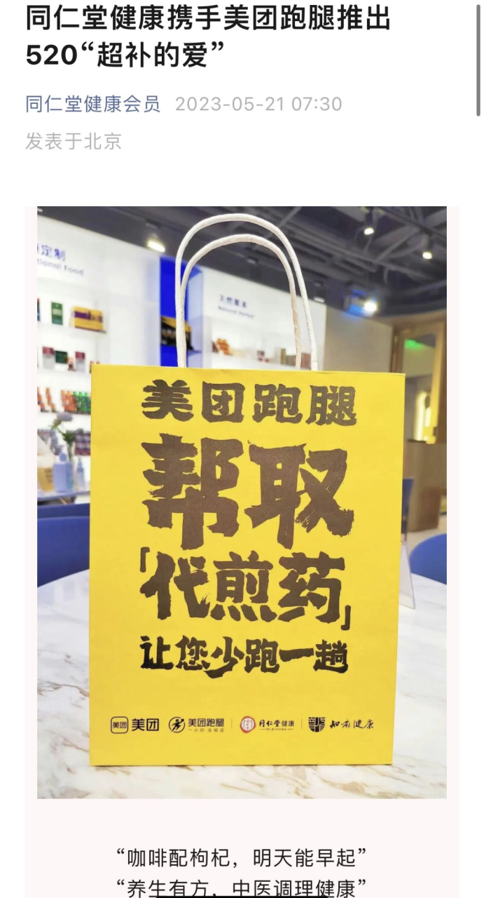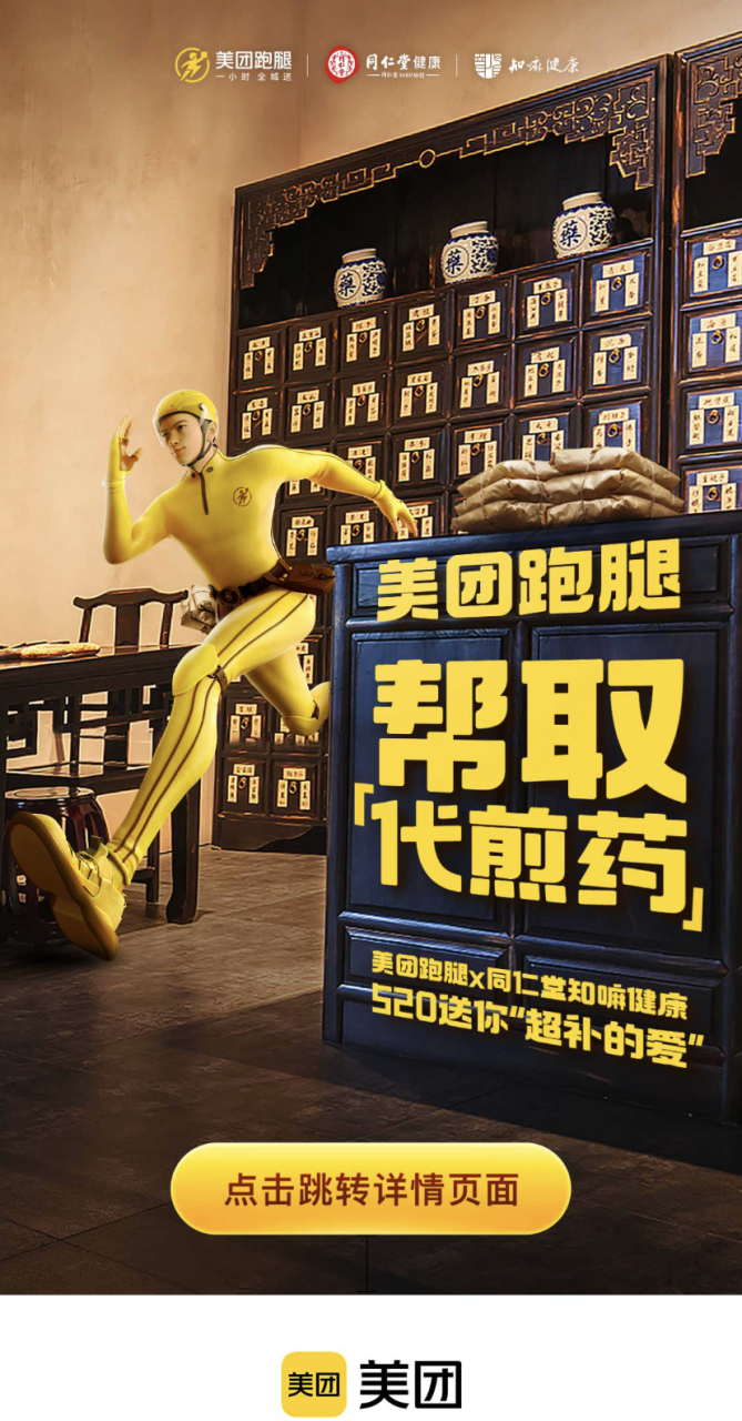 而这,也是美团跑腿找到同仁堂旗下的知嘛健康跨界合作的又一重要原因。虽然同仁堂是中药老字号的代表品牌,但受限于药品的特殊性,如果直接输出美团跑腿可以帮取「代煎药」的信息,在吸引力和触动的程度上可能并不会很深。